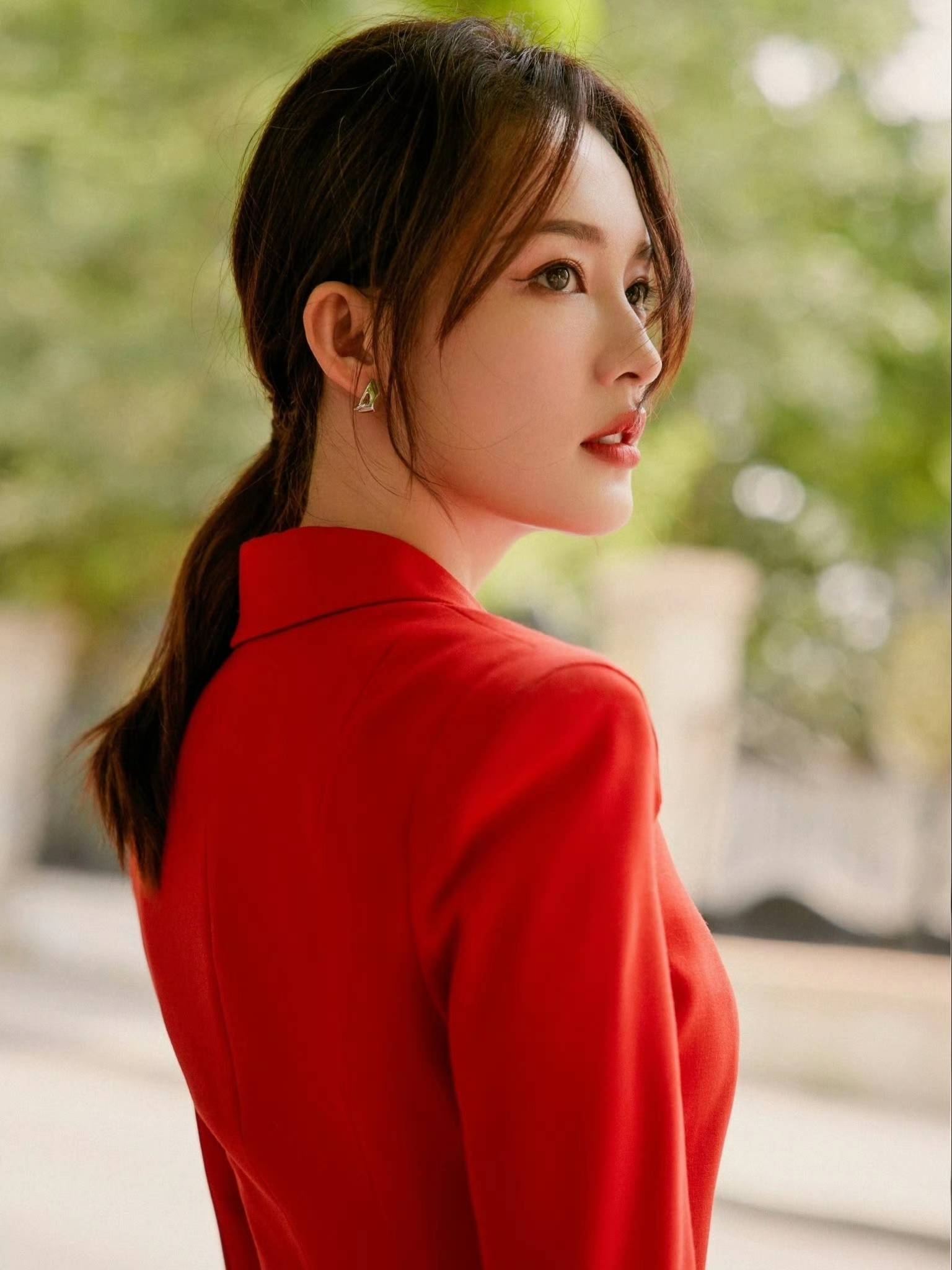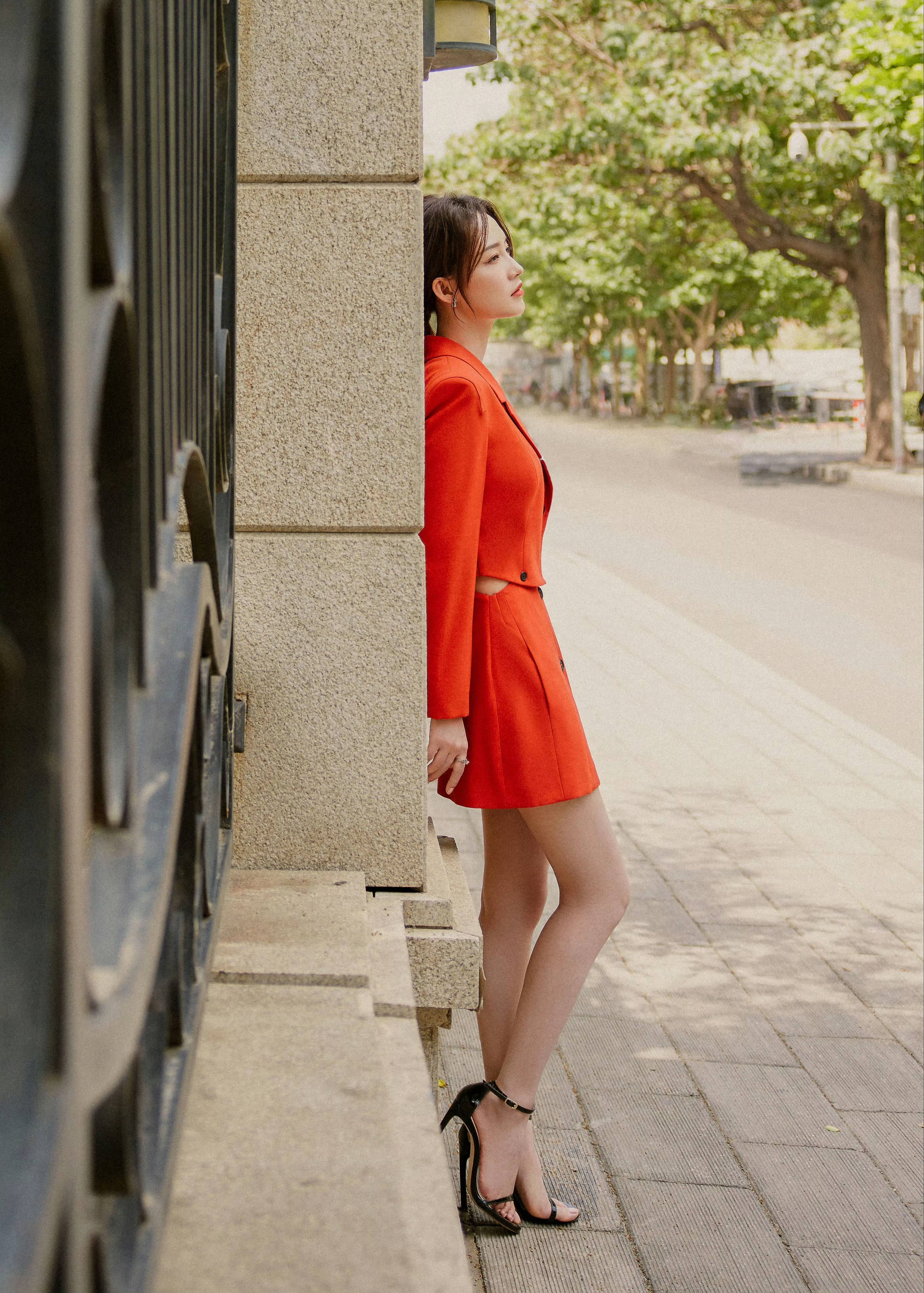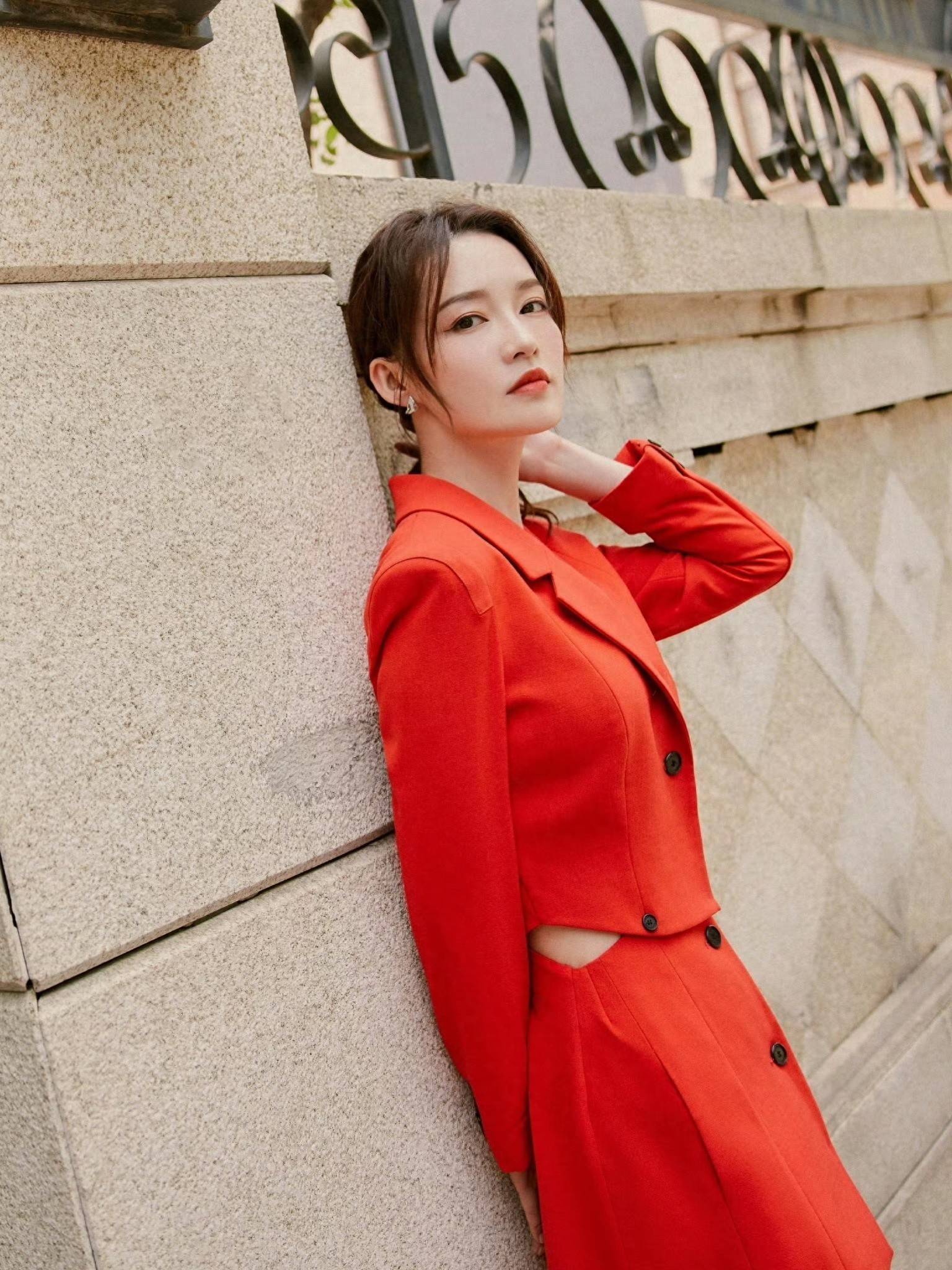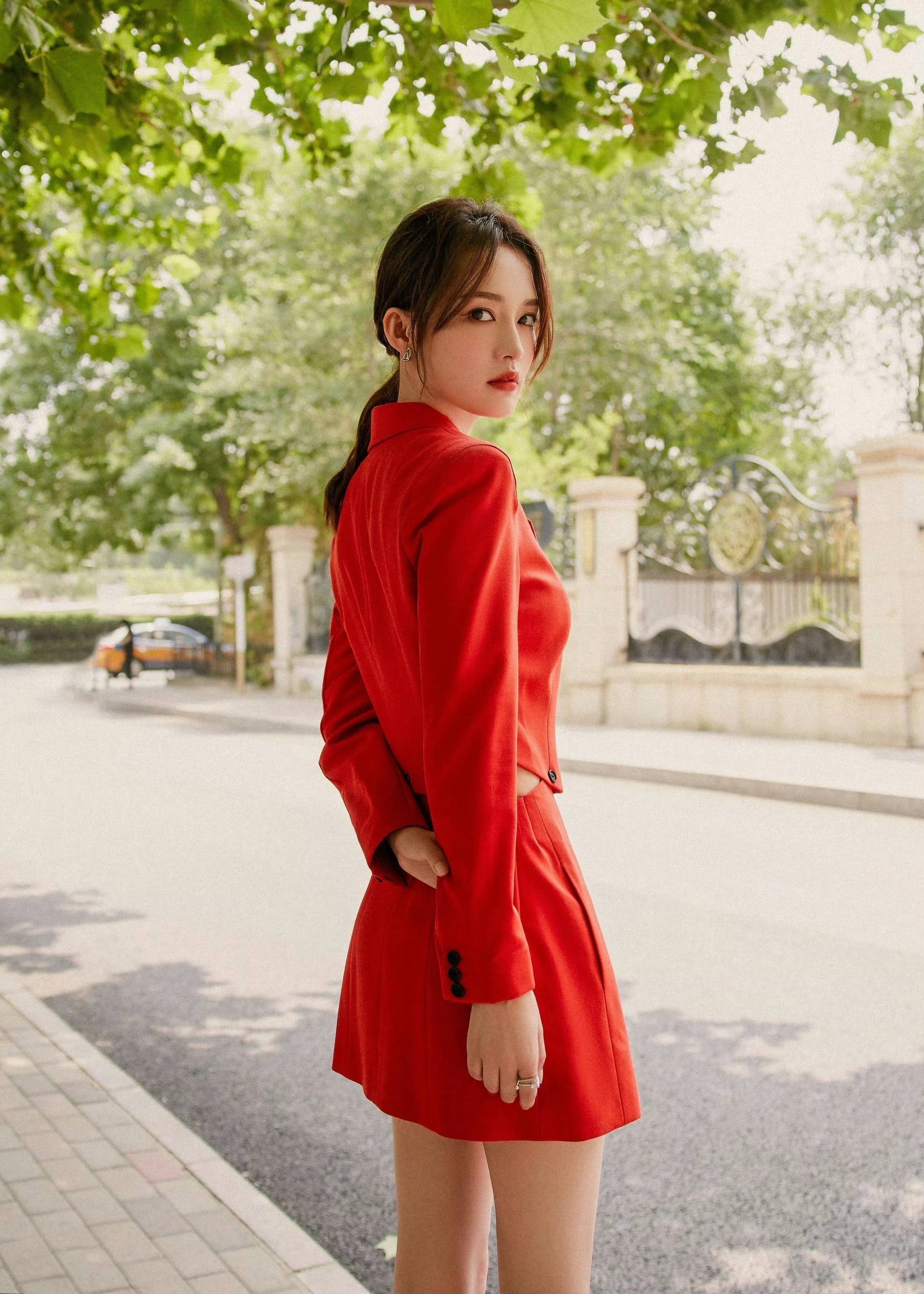 李沁红色西装套裙穿搭,成街头时尚亮眼风景